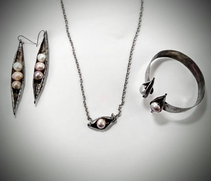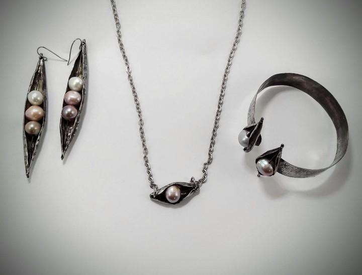 Tento krásny perlový set, ktorý dýcha históriou bude pre Vás všetky, ktoré túžia po originálnom šperku ten pravý. Perla riečna s bielou pocínovanou mosadzou na retiazke z chirurgickej ocele. Dĺžka prívesku 60cm, prívesok 3 x 1,5cm. Náramok 4,5cm x 4cm a náušnice 8cm.