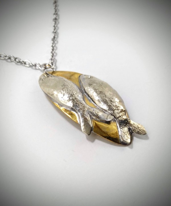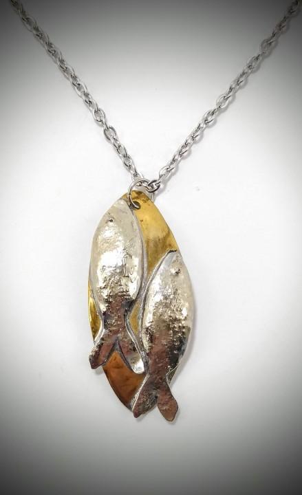 Náhrdelník rybky z bielej a žltej mosadze. Retiazka z chirurgickej ocele.