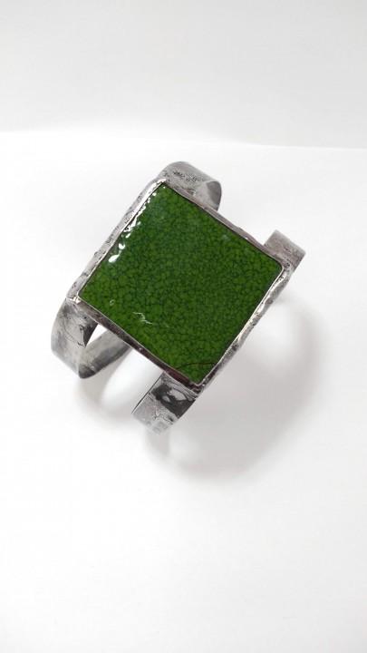 Ručne vyrobená keramika v zmyselnej zelenej farbe, zasadená v kove.
