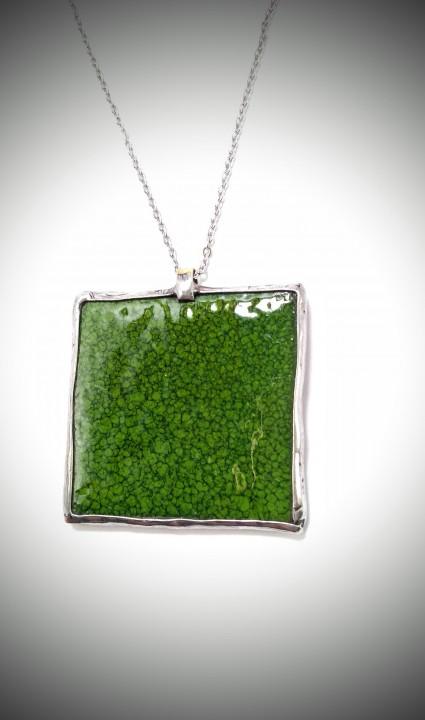 Ručne vyrobená keramika v zmyselnej zelenej farbe, zasadená v kove. Retiazka z chirurgickej ocele.
