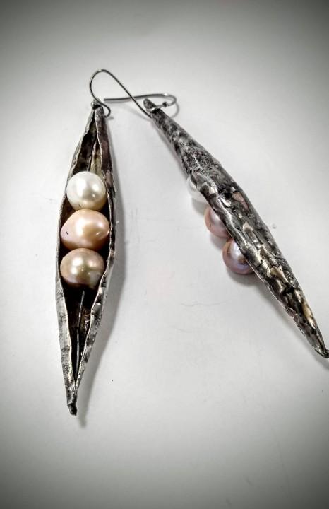 Náušnice s troma rôzne farebnými riečnymi perlami, vsadené do pocínovanej mosadze.